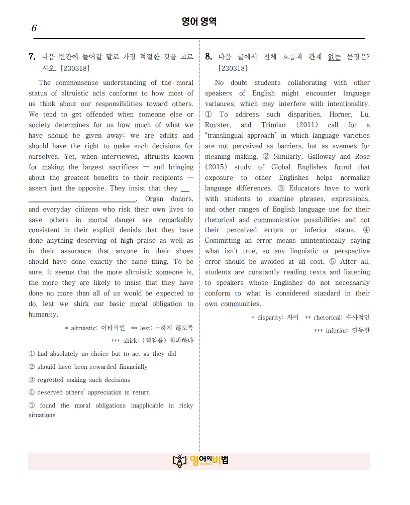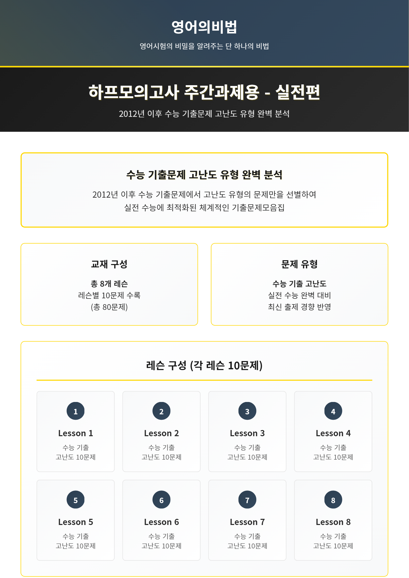 고3 수능영어 모의고사에서 고난이도 10문제를 선별하여 8회차로 구성한 주간과제용 교재