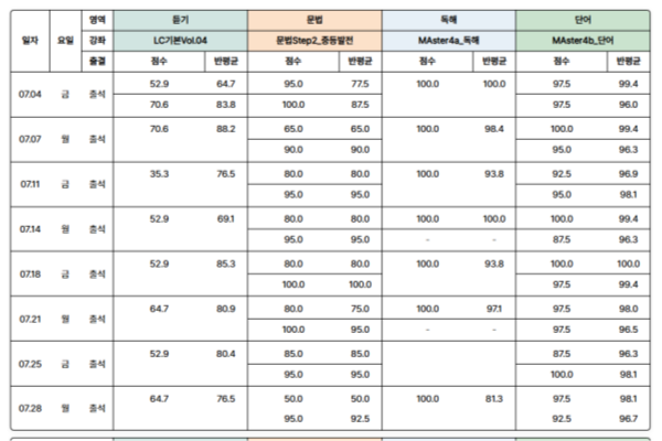Daily TEST의 결과는 수업 종료 5분 후에 학부모님의 카톡으로 성적표 전송